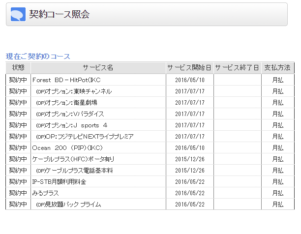 (1)ご契約コース照会のご利用方法 ご契約コースを表示します。 ①各コースを選択することで、詳細を表示することができます。 ※Forest・ライト・ベーシックはテレビサービス、ocean・CATVINTはネットサービス、ケーブルプラスは電話サービスのそれぞれの名称です。 |
