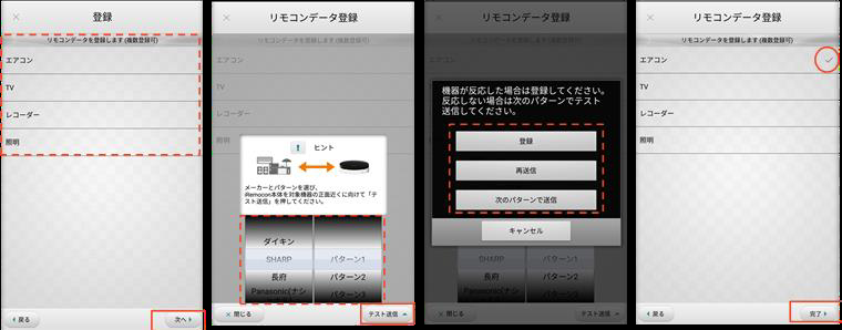 パターンは各家電で異なりますので、それぞれ【テスト送信】をタップしてチェックし、機器が反応した場合は【登録】をタップしてください。
