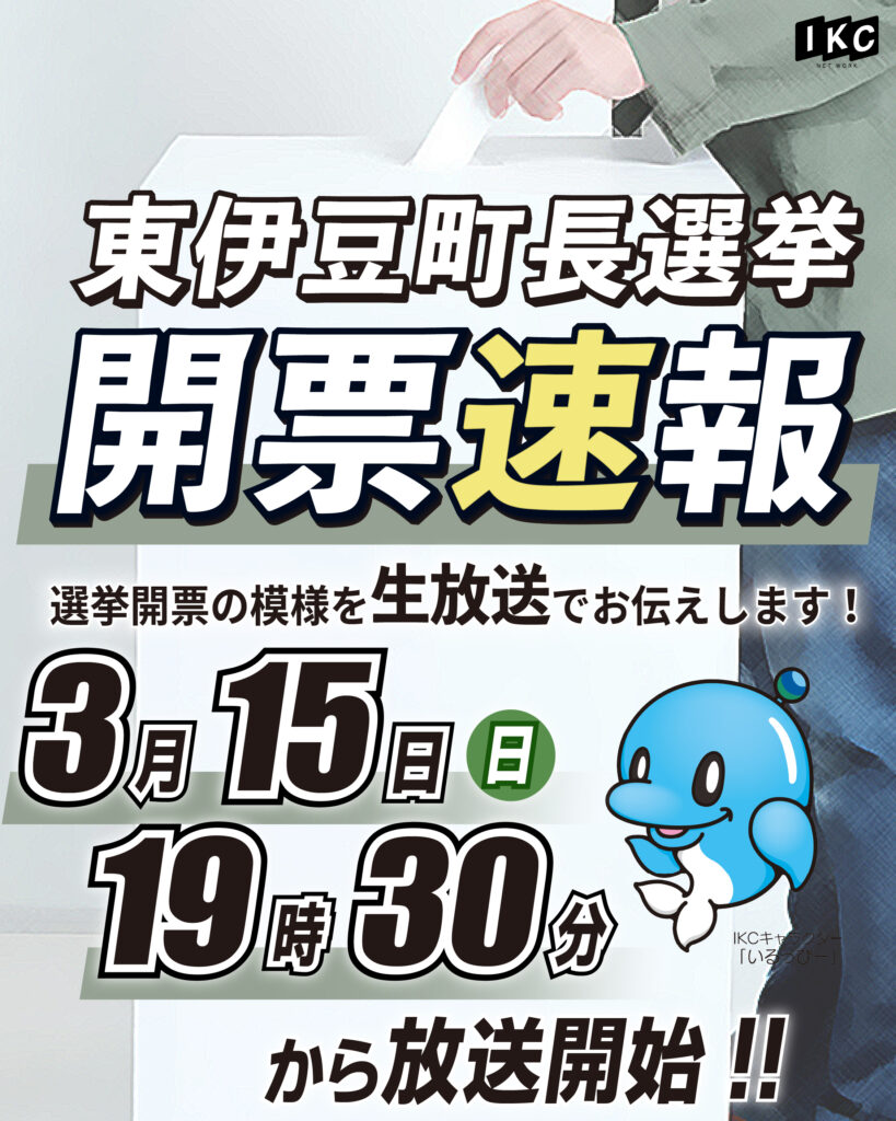 『いるかチャンネル(121ch)』にて「東伊豆町長選挙 開票速報」を生放送いたします。