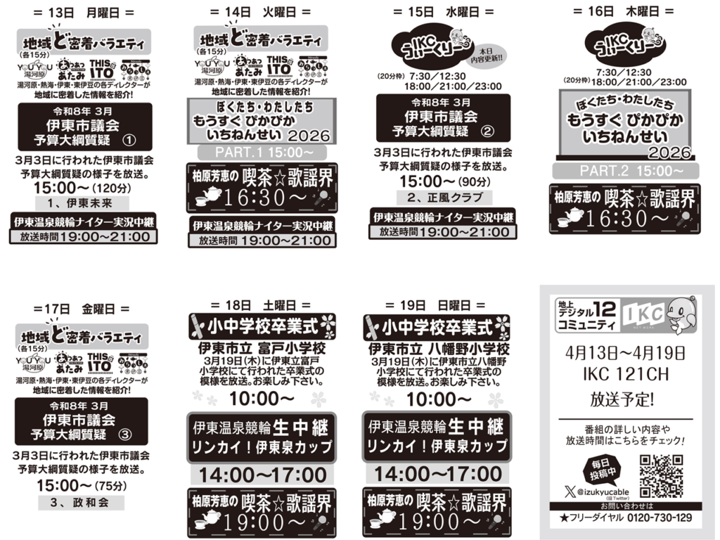 🔷伊東市議会 予算大綱質疑🔷伊東温泉競輪ナイター 生中継🔷柏原芳恵の喫茶☆歌謡界🔷ぼくたちわたしたちもうすぐぴかぴかいちねんせい🔷富戸小学校卒業式🔷八幡野卒業式🔷伊東温泉競輪生中継 リンカイ!伊東泉カップ