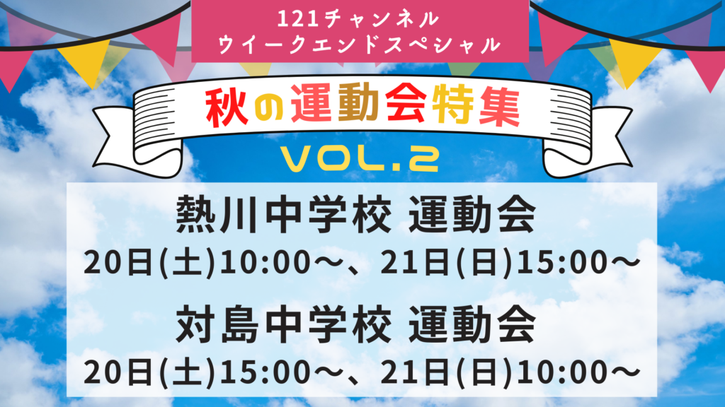 秋の運動会特集として、10月に行われた小中学校の運動会・文化祭・体育祭を土日のウイークエンドスペシャルにて順次放送!第2弾の今回はご覧の学校を放送いたします。